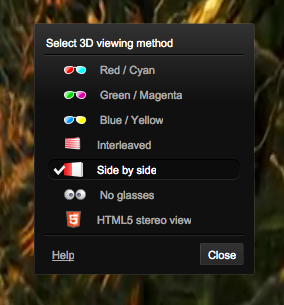 If you click, it will open a menu and give you as many options as any 3D Geek could wish for. For example, you could then click "side-by-side" if you were using an active shutter 3D TV, like this Sony. From there, you will get a whole world of extra options just within the side-by-side format. Have fun and try them all out in order to get the best 3D experience on the web!