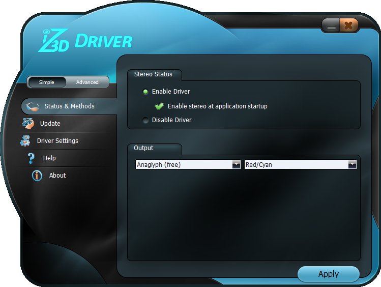 Due to iZ3D Discontinuing Operations on July 31st, 2012, licenses for this driver are no longer available. Users may continue using the free Anaglyph output, but all other outputs will cease to function after the 30-day trial.