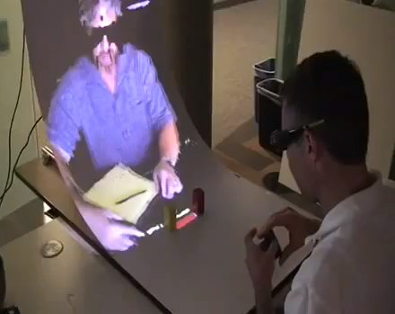 The system uses Microsoft's Kinect to capture objects (and you) in 3D, plus track your head so it knows where you are looking. Then, a stereoscopic 3D projector is used to display the images back to you on a simple display (a piece of white paper in this case). You can then interact with and manipulate objects in virtual space, in full 3D. Crazy, huh?